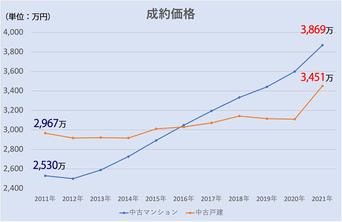 中古不動産の平均成約価格は大きく値上がりを続けています。