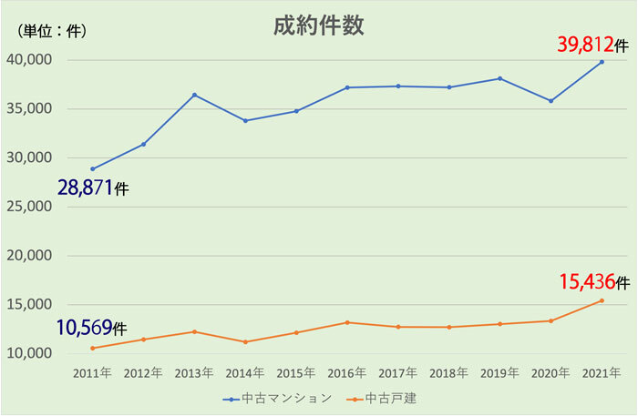 同様に、売買が行われた不動産の成約件数も2011年から右肩上がりに増加しています。