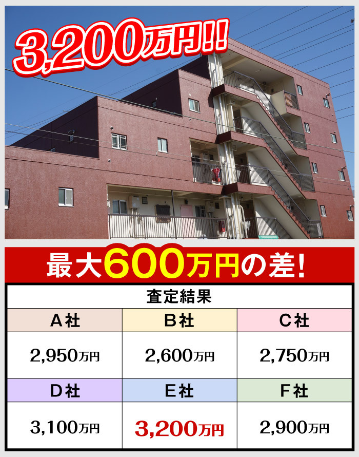 大手と地元の不動産会社に複数依頼したところ、地元の方が500万以上も高く売れました。大手〜地元まで複数社の査定を比較できてよかったです!